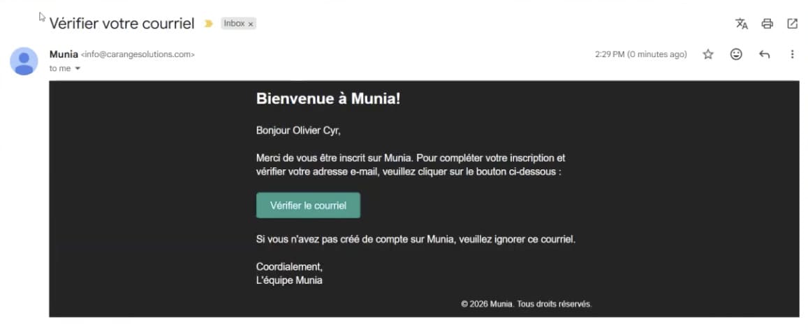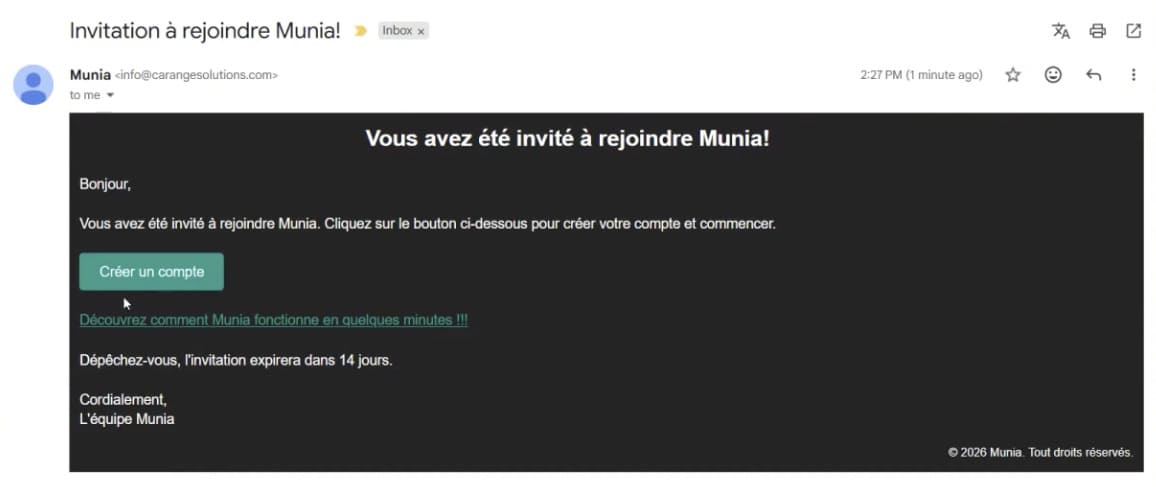 Repérez le courriel intitulé « Invitation à rejoindre Munia » dans votre boîte de réception. Cliquez sur le bouton vert pour accéder au formulaire de création de compte.