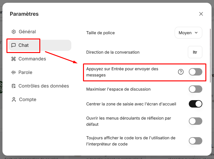 Étape 2 : Localisez la section « Chat » et désactivez l’option « Appuyez sur Entrée pour envoyer des messages ».