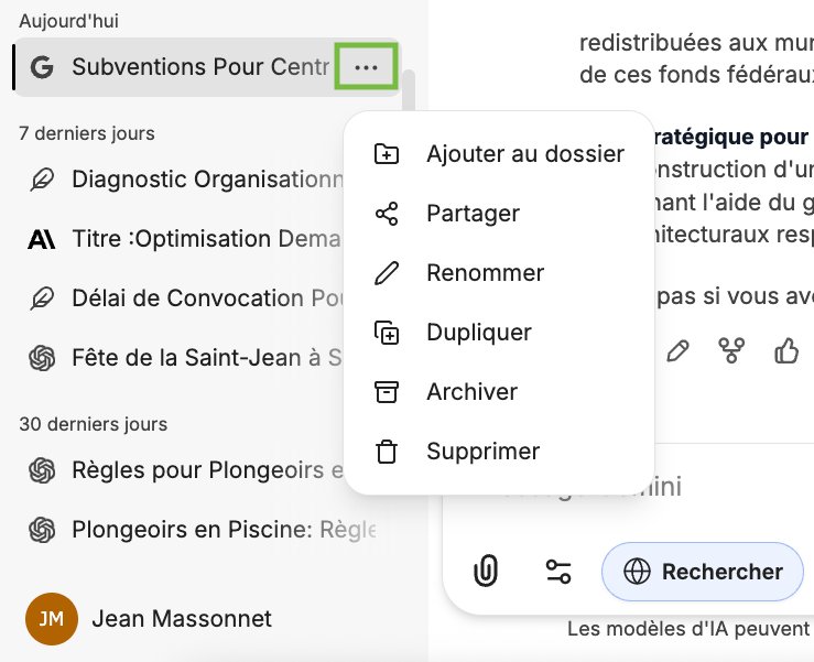 À mesure que vous utilisez Munia, les conversations s’accumulent dans la barre latérale gauche, classées de la plus récente à la plus ancienne. Plusieurs outils sont disponibles pour vous aider à vous y retrouver rapidement.
