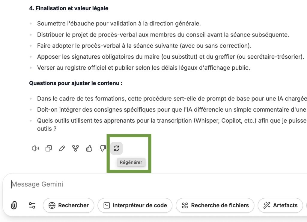 Résultat attendu: Une nouvelle réponse est générée par l’intelligence artificielle et s’affiche dans votre conversation, en remplacement ou en complément de la précédente.