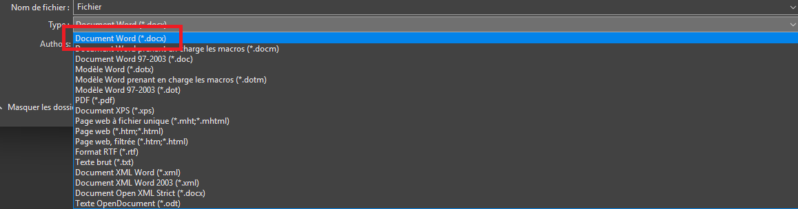 Dans la liste déroulante du type de fichier, choisissez la première option du haut (dans le cas des fichiers Word, il faut sélectionner Document Word (.docx)).